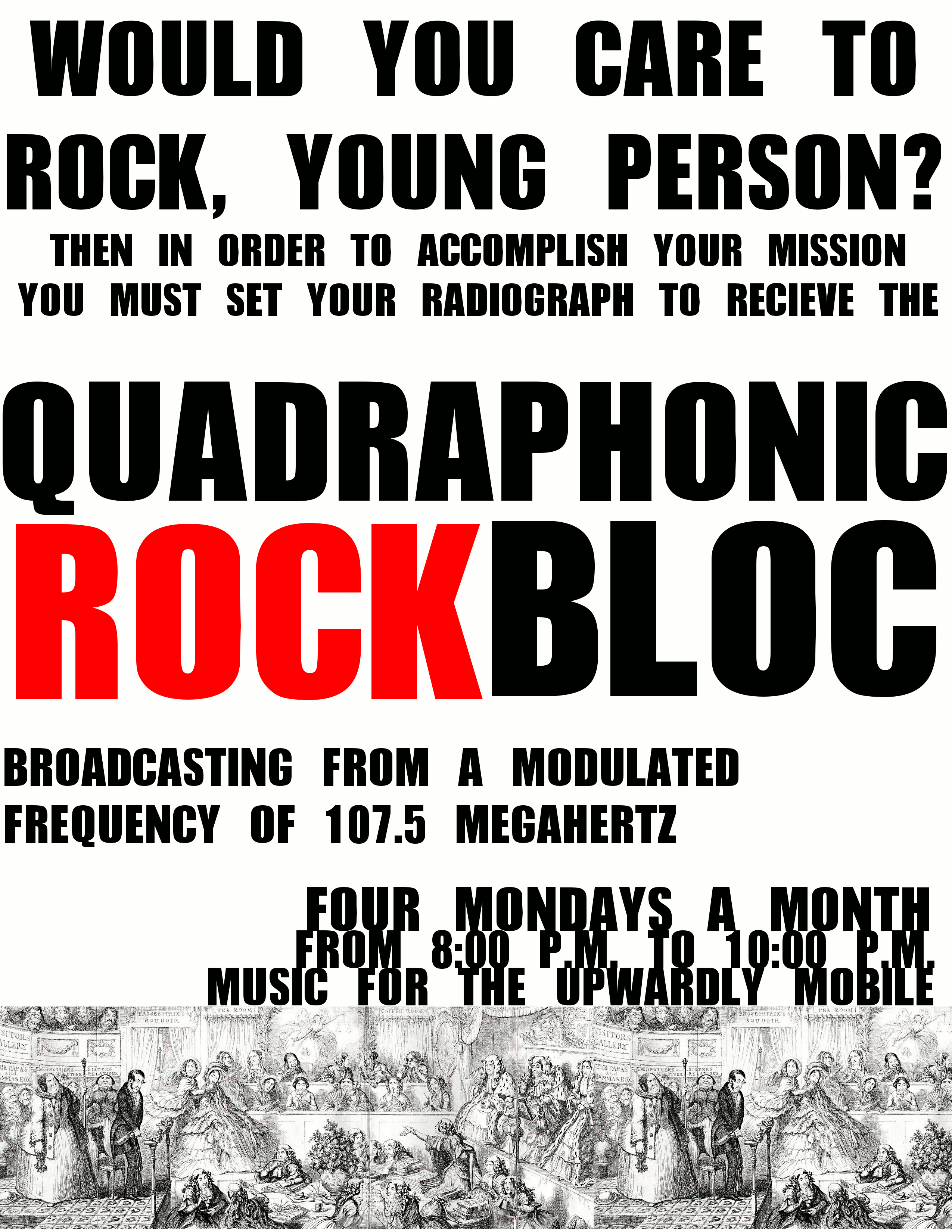 The Quadraphonic Rock Block started in 2004 in Kirksville, Missouri. My first attempt at college was at a weird, small, fun little school called Truman State University in the middle of absolutely nowhere. I had a friend online who went there and I applied on a whim, and not knowing what else to do with my life, decided to try my luck at Truman after high school. Four thousand panic attacks later I retreated back home to Arizona, but not before (a) meeting the woman who would become both a great friend and the mother of my children, and (b) getting a radio show on Dobson Radio, a tiny little station run out of my dorm. I named it the Quadraphonic Rock Bloc (no k for cool reasons) because it sounded awesome, and I spent most of my shows playing the Smiths and Mogwai and Neutral Milk Hotel and generally broadcasting my angst to the three people who were able to receive our tiny little signal. Those playlists are lost to time but trust me, that's for the best.
