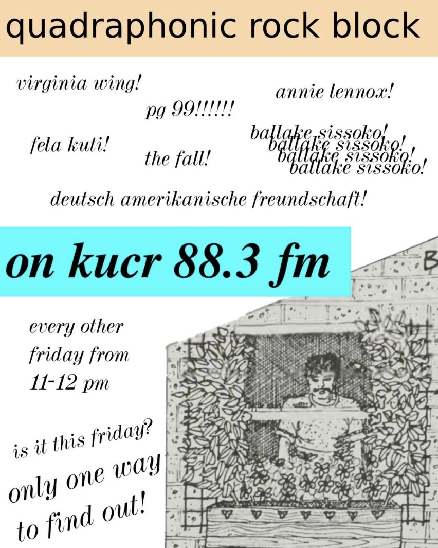 In 2021, I got the chance to join the genuinely wonderful people at KUCR and the Quadraphonic Rock Block came back to life, with an added "k" at the end of "Bloc" because I am now 40. It remains the highlight of my Fridays, and I feel truly fortunate to have the chance to share music that I love with people I don't know. I hope you hear something you like ❤️ And get in touch if you ever feel the urge!